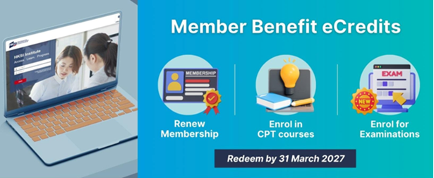 為答謝會員的持續支持,學會將於 2026 年 4 月 14 日贈送eCredit至會員的電子服務網站帳戶內。會員可使用eCredit參加考試、專業培訓課程及支付續會年費,藉此提升會員對學會優質服務的體驗,並提供更多機會促進會員的專業發展。