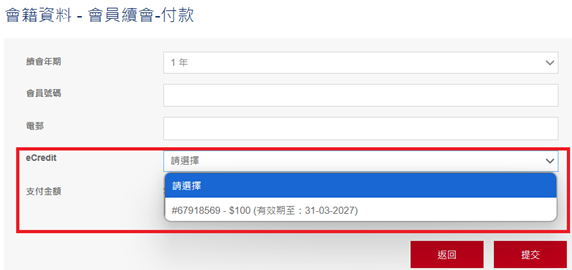 - 如使用eCredit續會,請從目錄中選取「會籍資料」,並在提交「年度聲明」後點擊「付款」。一旦選擇使用eCredit,系統將在扣減eCredit後自動計算續會費的應付金額(如有)。