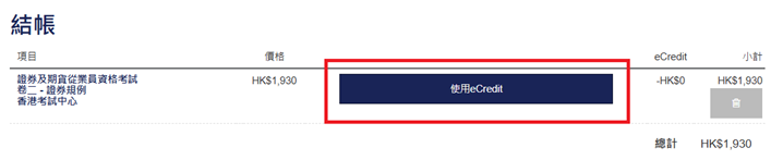 - 如使用eCredit報名參加考試或專業培訓課程和網上研討會,請按「報名」以瀏覽可供選的考試、持續專業培訓(CPT)課程,然後在您選擇的活動中點擊「添加到購物車」。在「結賬」頁,如eCredit適用於已選活動,請點撃「使用eCredit」,應付金額(如有)將在扣減eCredit後自動計算。詳情請參考使用eCredit教學視頻 (只提供英文版)。